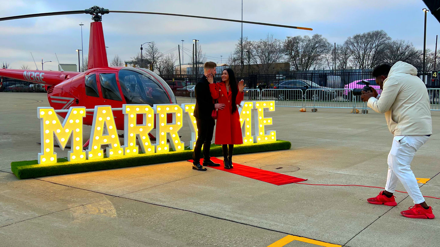 Fly Heli’s VIP Celebration Package includes a 16-mile luxury tour over Chicago, champagne, forever roses, and a photo op with “B DAY,” “LOVE,” or “MARRY ME” letters and a helicopter backdrop—perfect for unforgettable celebrations.