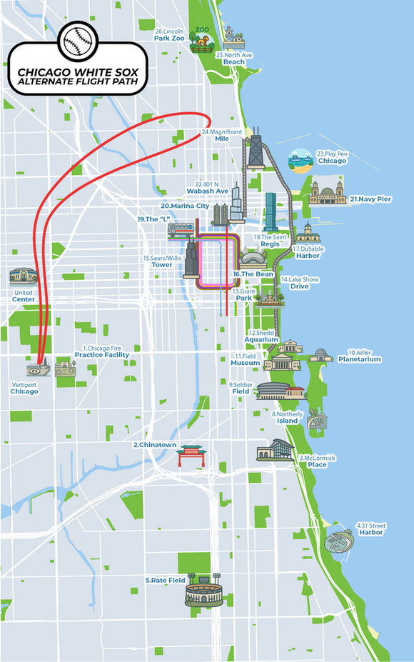Lift off from the Vertiport and head southeast for a thrilling view of Chicago’s skyline. You’ll fly east toward the lake and then turn north, tracing the shoreline past Grant Park, Buckingham Fountain, and up to the north end of the Museum Campus. After taking in sights like Soldier Field and the Shedd Aquarium, the route turns south for a second pass along the lakefront, offering stunning views of the city from a new angle. The tour wraps up with a westbound return to the Vertiport, closing out a smooth and scenic loop over downtown.