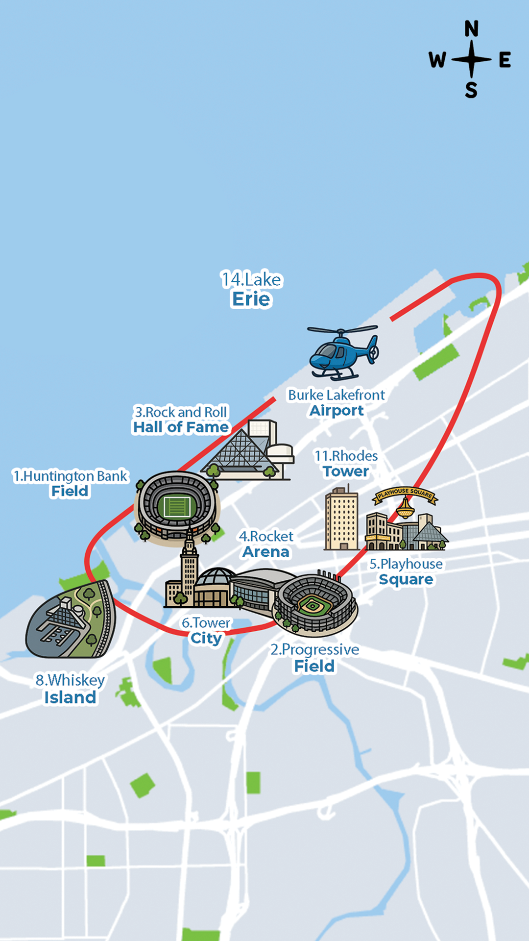 Discover Cleveland from above on a thrilling helicopter tour showcasing the city’s most iconic landmarks. Enjoy sweeping views of Downtown Cleveland, including Huntington Bank Field, Rocket Mortgage FieldHouse, and Progressive Field. Soar past cultural gems like Playhouse Square and the towering Rhodes Tower, then take in the beauty of Whiskey Island along Lake Erie. The flight also features a unique perspective of Tower City, blending the city’s historic architecture with its modern skyline.