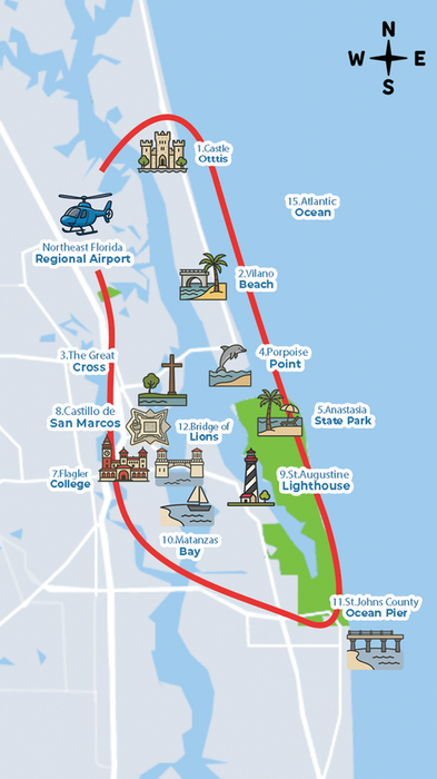 Explore the charm of St. Augustine from above on this scenic helicopter tour. Fly past the unique architecture of Castle Otttis, then take in the coastal beauty of Vilano Beach and the vibrant sandbar at Porpoise Point. Capture stunning aerial views of the iconic Great Cross, standing tall over the city’s historic coastline. A perfect blend of history, nature, and breathtaking scenery.