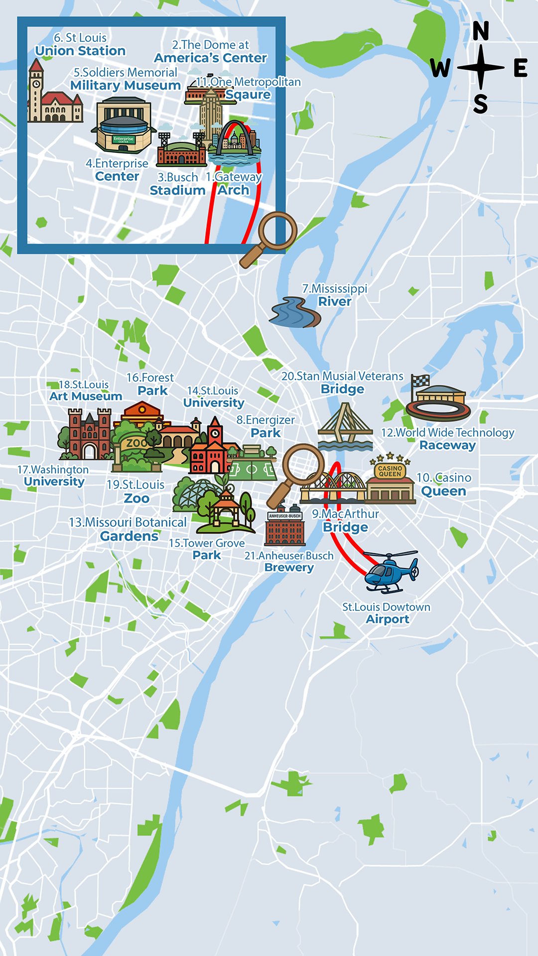 Soar above St. Louis on the Arch Tour, where every turn reveals a new landmark from a breathtaking angle. Glide past the historic MacArthur Bridge, circle the shining Gateway Arch, and take in the towering One Metropolitan Square as it dominates the skyline. Sports fans will love the aerial view of Busch Stadium, home of the Cardinals, before sweeping across the Mississippi River for even more unforgettable sights. This tour blends history, architecture, and excitement into one unforgettable flight.